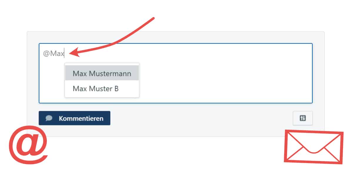 Um einen Nutzer zu markieren tippen Sie das @-Zeichen und die Anfangsbuchstaben des Vor- oder Nachnamens Ihres Kollegen ein. Danach erscheint eine Drop-down-Liste mit allen passenden Nutzern Ihres Accounts.